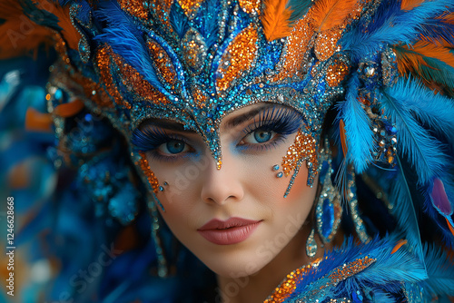 Photo de détails de costumes de carnaval avec paillettes, strass et plumes colorées. broderies fleurs et perles. costume, mode, vêtement, déguisement, habit,