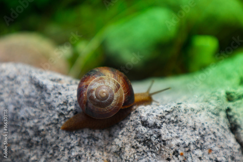 Photo depicts a wild lovely big beautiful snail with spiral shell. Amazing helix in the garden, crawling in a stone. Fresh green grass on the background, good sunny weather. Marco, close up view.
