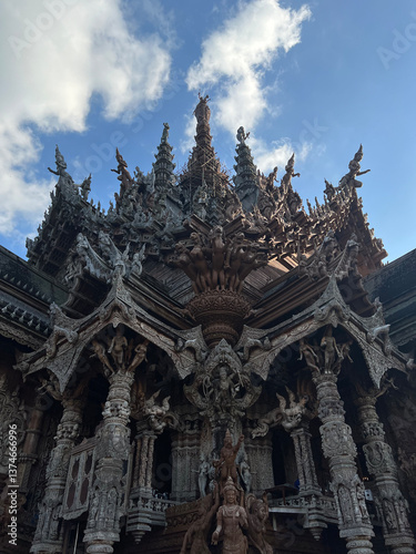 Photo du Temple de la Vérité à Pattaya, en Thaïlande, mettant en lumière ses sculptures en bois finement travaillées et son architecture spirituelle. Chef-d'œuvre ornemental, reflet d'une tradition