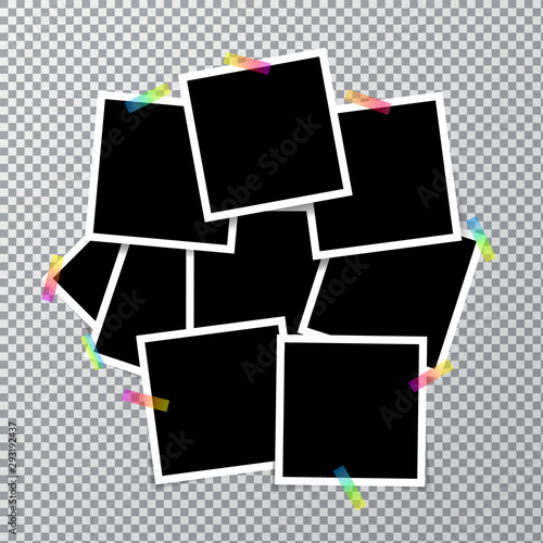 Photo frame on transparent background. Many photo frames for your design, with transparent adhesive tape for your color. Vector illustration