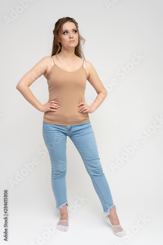 Photo full-length portrait of a pretty brunette woman girl with long beautiful curly hair on a white background in a t-shirt and blue jeans. Talking while standing in front of the camera.