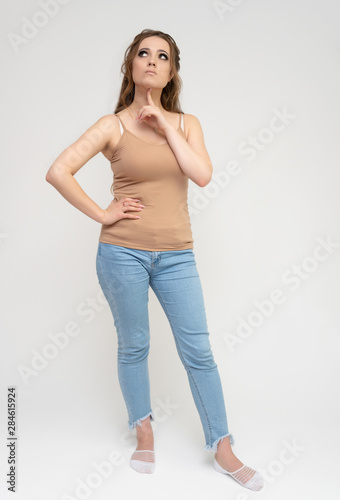 Photo full-length portrait of a pretty brunette woman girl with long beautiful curly hair on a white background in a t-shirt and blue jeans. Talking while standing in front of the camera.