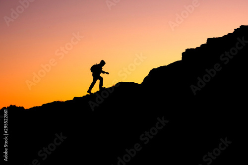 photo in a dark key of a man climbing a mountain