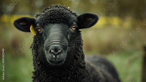 Photo of a black sheep by scissors for haircut with text space and high resolution