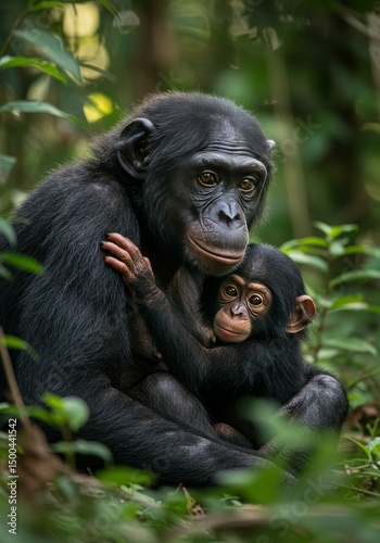 Photo Of A Bonobo Mother And Child Embracing Each Other In Lush Green Forest