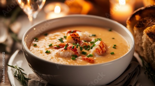 Photo of, A bowl of creamy lobster bisque garnished with chives, Bisque in bowl