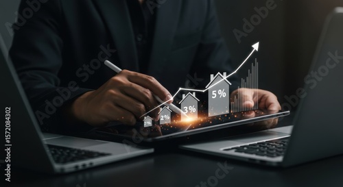 Photo of a businessman analyzes real estate investment growth data on a tablet with two laptops