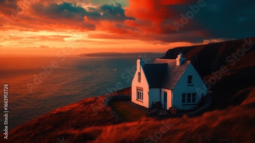 photo of a cottage overlooking the coast in West Wales, incredibly vivid colors, autumn colors in hues of red and gold, vivid blues, incredibly striking sunset