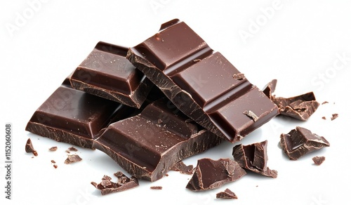 Photo of a dark chocolate bar, with pieces isolated on a white background.