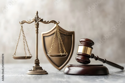 Photo of a gavel and scales next to an abstract shield with a checkmark on a light background, representing the concept of legal protection, Generative AI
