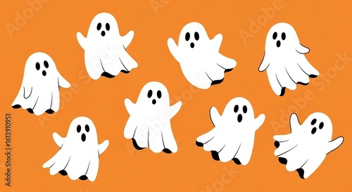 Photo of a group of cute cartoon ghosts floating on an orange background for halloween celebration