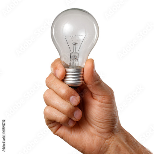 Photo of a hand holds a light bulb illuminating the concept of a bright idea representing innovation and creative solutions isolated on transparent background
