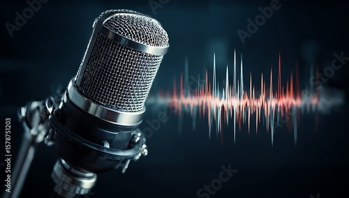 Photo of a microphone and sound waves in an audio studio, representing podcasting or dentistry with copy space for text. Web banner with copy space on the right. .