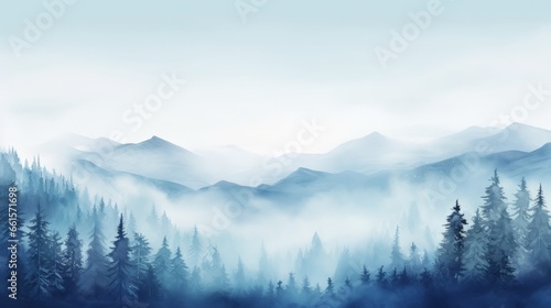 Photo of a mysterious mountain landscape with fog and towering pine trees