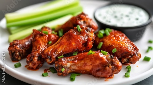 Photo of, A plate of spicy buffalo chicken wings served with celery sticks and blue cheese dressing, Chicken wings centered