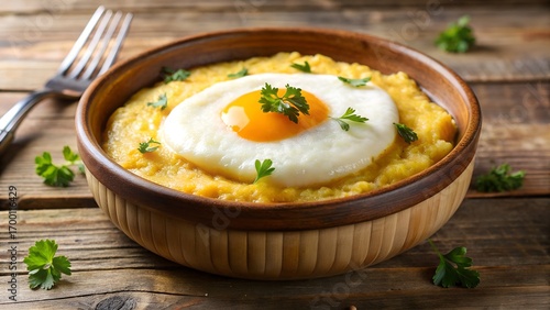 Photo of a rustic wooden bowl filled with creamy polenta, topped with a perfectly fried egg and garnished with fresh parsley leaves