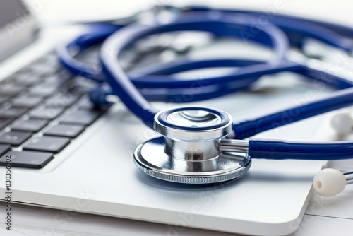 Photo of a stethoscope and laptop on a white background, symbolizing medical technology for an online video about digital healthcare.