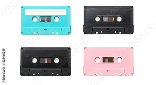 Photo of a stylish set of vintage audio cassette tapes in turquoise, black, and pink isolated on transparent background