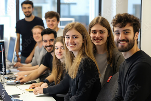 photo of a team of young business men women working in teamwork on their computer in an office smiling into the camera