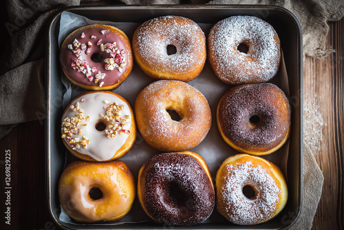 Photo of a tray with different types of doughnuts, including frosted and dusted glazed doughnuts, top view, natural light.