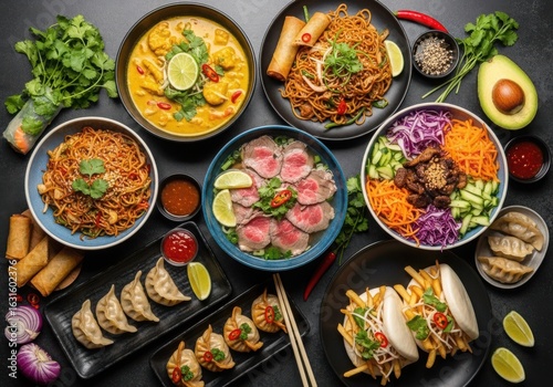 Photo of a vibrant overhead view of a diverse asian feast, featuring noodles, dumplings, bao buns, soup, salad, and beef, arranged artfully on a dark surface