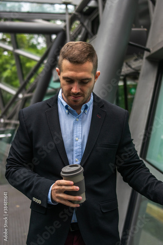 Photo of a young and attractive business man enjoying his coffee break outdoors. He is wearing smart clothes and is drinking in a reusable cup