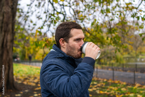 Photo of a young and attractive man enjoying a cup of coffee walking in the park during a day of autumn.