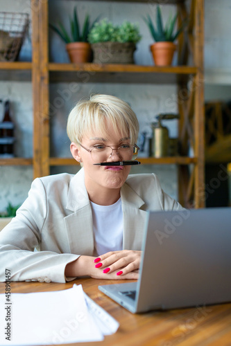 Photo of a young blonde with glasses in front of a laptop. She is tired of work and fooling around during an online business video call.