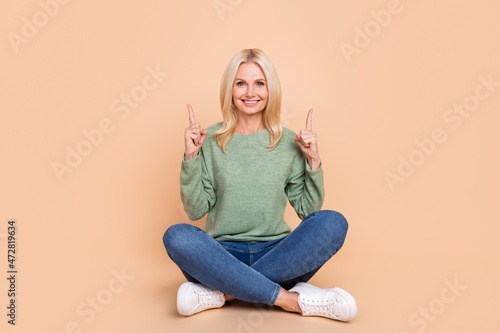 Photo of adorable cute lady pensioner dressed green pullover pointing up empty space isolated beige color background