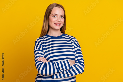 Photo of adorable cute woman wear striped stylish clothes arms folded isolated on yellow color background