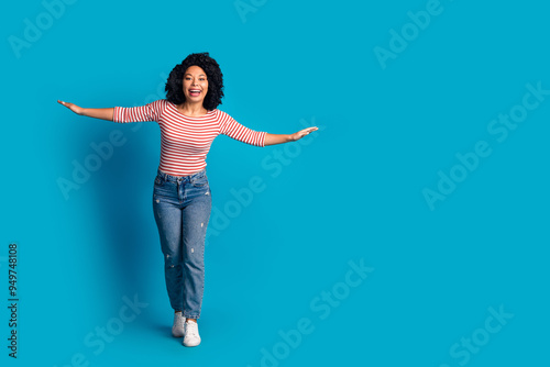 Photo of adorable lovely positive girl wear trendy clothes going string tightrope empty space isolated on blue color background