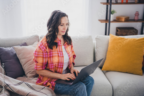 Photo of adorable sweet lady wear plaid shirt communicating apple samsung modern device indoors room home house