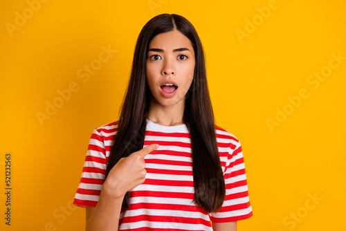 Photo of amazed pretty young lady wear red clothes open mouth pointing finger empty space isolated yellow color background