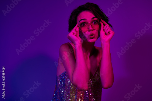 Photo of amazed young girl bob hair touch specs surprised wear fluttering stylish crop top pouted lips isolated on neon light background