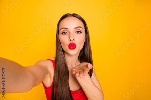 Photo of amazing model lady making selfies hold hand send air kiss blog followers wear red swimming suit isolated yellow background