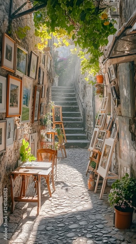 Photo of an alleyway in the ancient city center, walls covered with framed pictures and art pieces