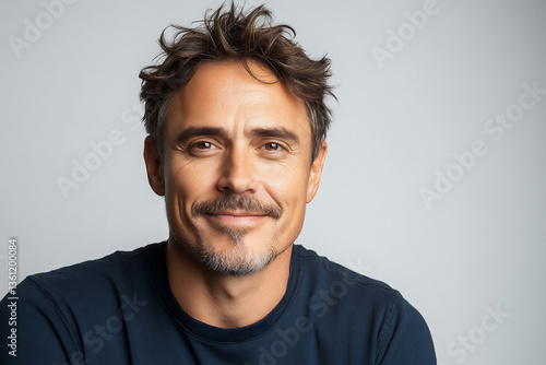 photo of an attractive italian man, with short hair and a goatee, wearing a dark blue t-shirt against a white background. he is smiling at the camera.
