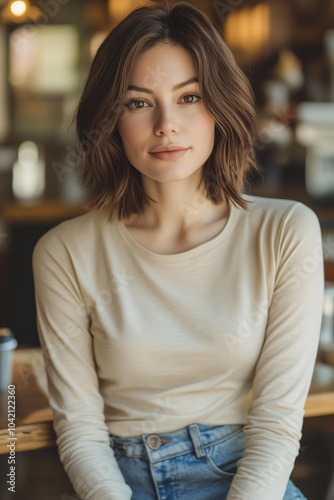 Photo of an attractive woman wearing jeans and a long-sleeved beige t-shirt, sitting in a coffee shop, with a bob haircut and shoulder-length hair, looking at the camera