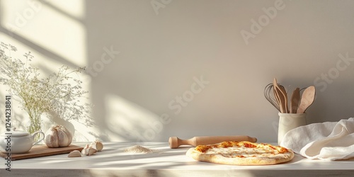 Photo of an unsliced pizza on the table with a rolling pin and ingredients, against a white background with copy space for text.