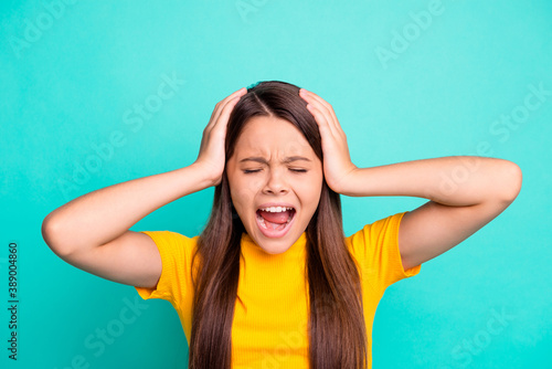 Photo of angry kid girl touch hands head shout wear casual bright style clothes isolated over teal color background