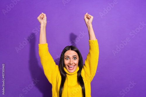 Photo of astonished cheerful person open mouth raise hands fists celebrate isolated on violet color background