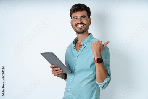 Photo of astonished crazy young caucasian man wearing green shirt hold smartphone dislike feedback concept