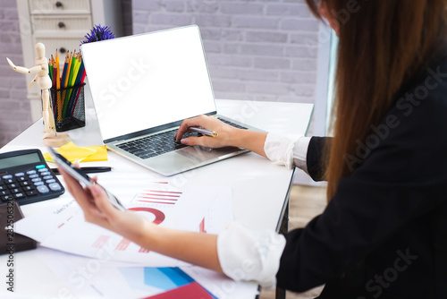 Photo of attractive business woman holding smartphone texting message and sitting at workplace for contact with customer in office.