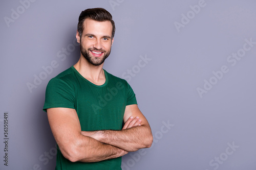 Photo of attractive guy business man boss worker neat hairdo bristle smiling beaming good mood arms crossed wear casual green t-shirt isolated grey color background
