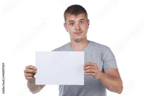 Photo of bristle man holding white paper sheet