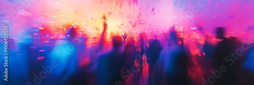 Photo of carefree clubbers blurred movement enjoy electro star performance raise hands up festival confetti modern neon filter panoramic