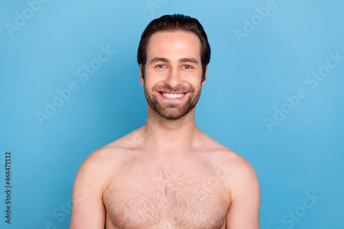 Photo of charismatic pretty young man naked torso smiling isolated blue color background