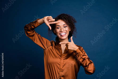 Photo of cheerful tricky woman dressed brown silk shirt eyewear stick out showing arms photo portrait isolated blue color background