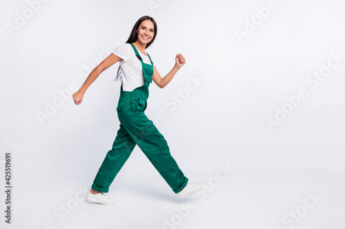 Photo of cheerful worker lady walk look camera wear green overall footwear isolated white color background