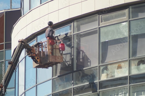 Photo of city works. A worker washes the facade of a building using a car platform, a lifting mechanism. Iron, glass, and concrete, nothing extra.